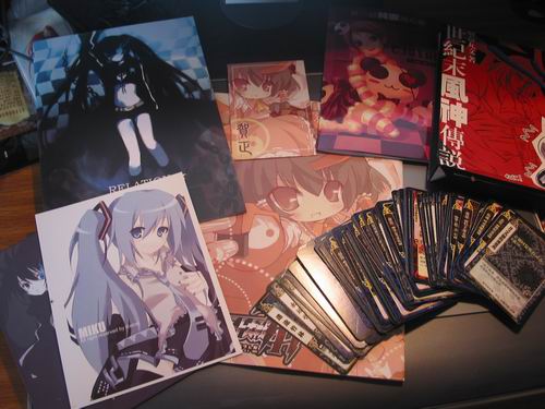 这次唯一入的是SKADE先生的东方机战小册子(后来又送了我一本- -),和妹妹的抱枕。其他赠品,分别为MCA丸子的BRS戏本与绯色永恒的东方TGF对战卡。雷米控还特地为我做了个神奇的水晶,真是谢谢谢谢- -