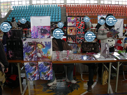 香香的左边是机战世界摊,今次拿到了预订的小抱枕和SKADE的签名,很高兴。CC3就想说了…SK的灵梦很萌!(喂,死茶壶,你挡着SK了……